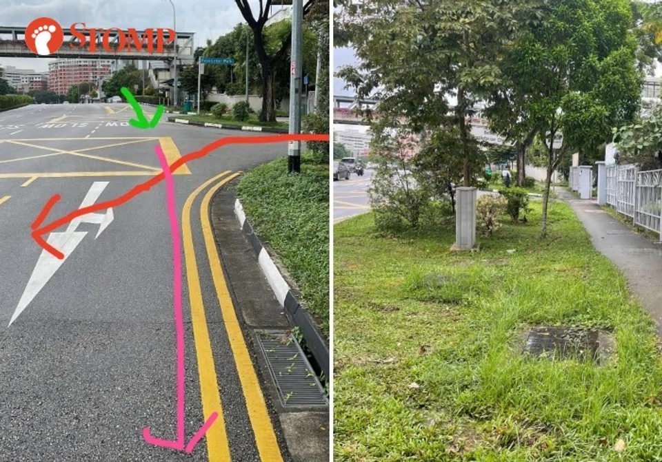 The Stomper recounted: "I was cycling in the direction of the green arrow while this car dashed out from the carpark of Bethany Presbyterian Church (red arrow) at 364A Upper Paya Lebar Road and caused me not to be able to brake in time. The result was I slipped, fell and skidded 50m as indicated by the pink arrow.