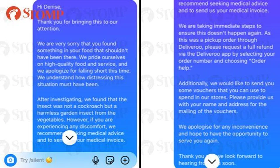 To report the incident, D took photos of her meal and sent them to Deliveroo, The Daily Cut and The Singapore Food Agency (SFA).
