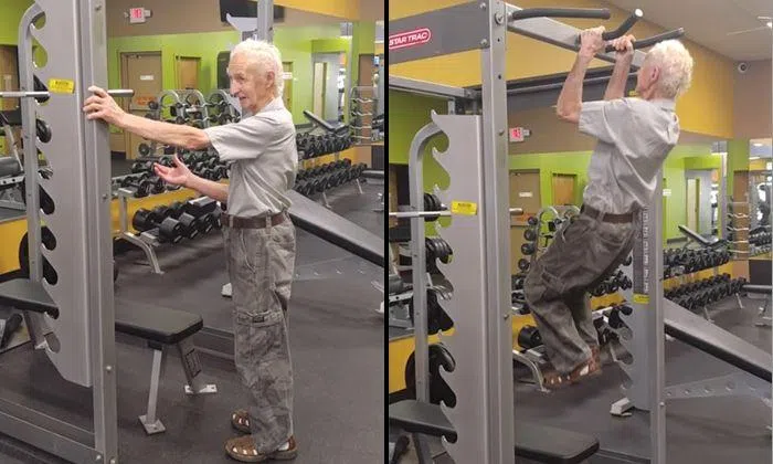 Despite his age, he still goes to the gym thrice a week and his son says that pull ups are his favorite exercise.