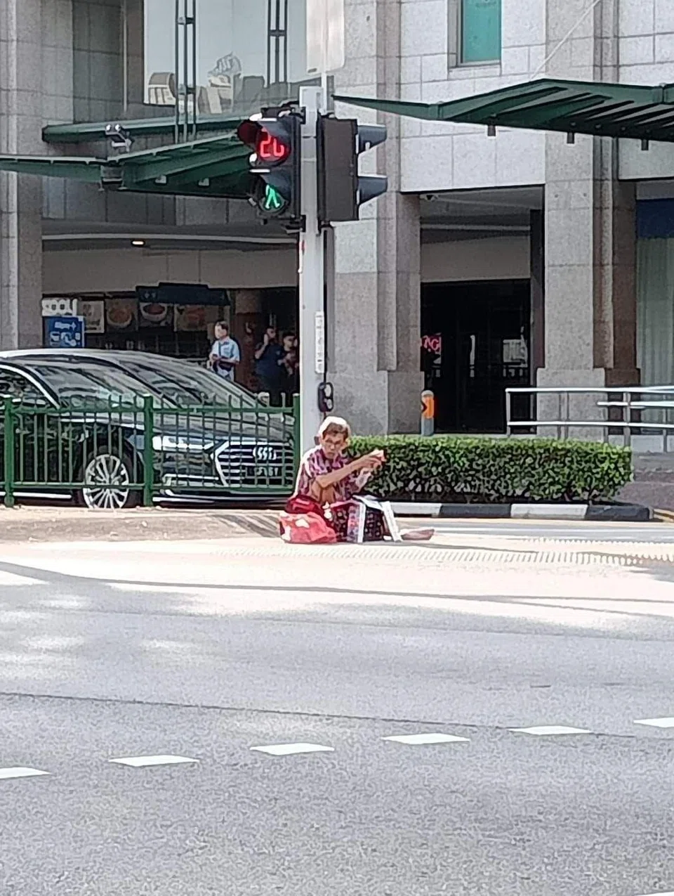 On the first occasion, the man was sitting on the intersection crossing in the middle of the road at Bugis Junction.