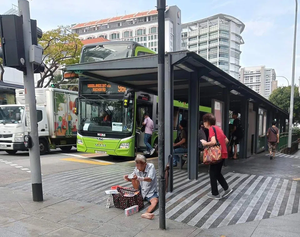 Elderly man sells tissue paper sitting in middle of pedestrian crossing and next to bus stop in Bugis