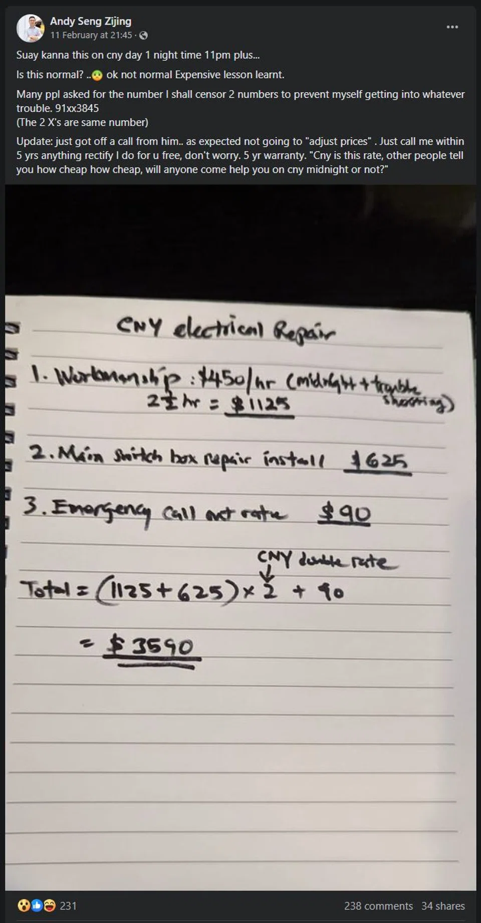 Electrician charges $3,590 to fix circuit breaker on first day of CNY at midnight: 'Is this normal?'