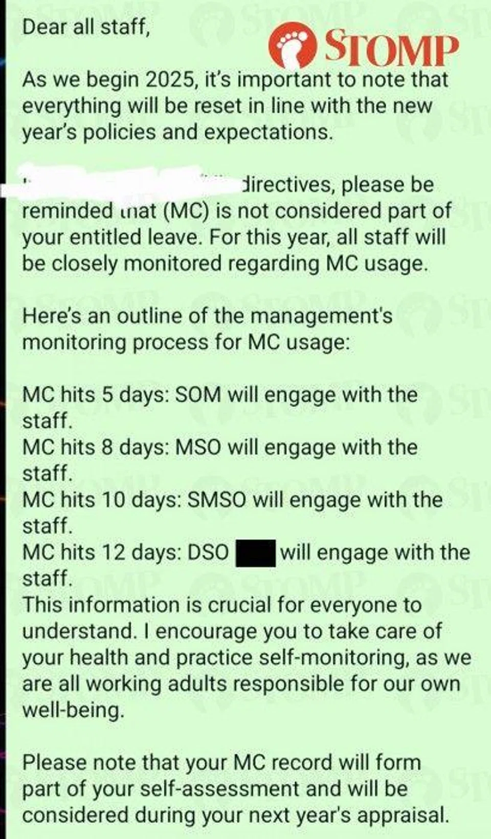 The message informed staff that MC usage would be "closely monitored" and outlined what would happen if they hit a certain number of medical leave days.