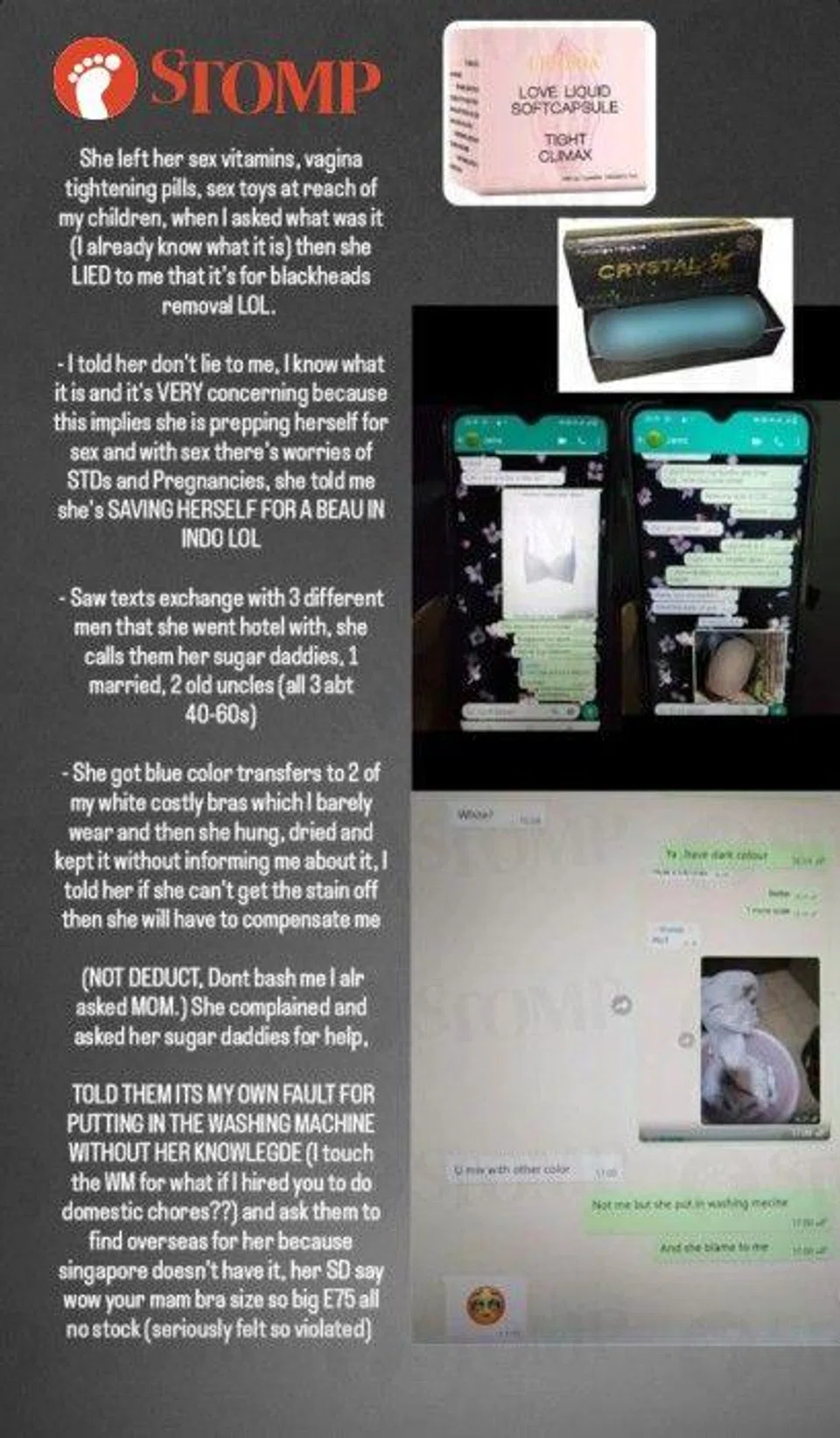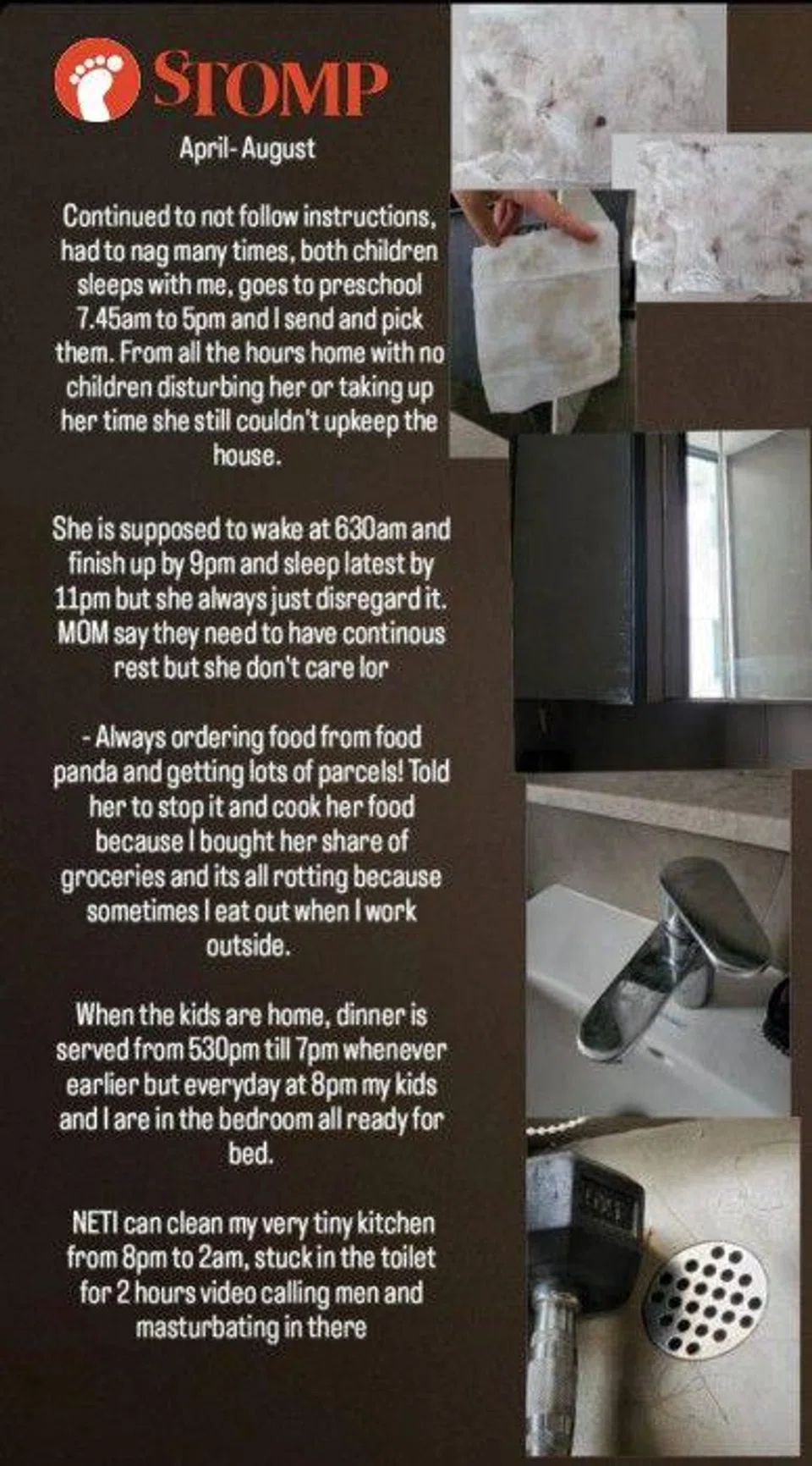 Stomper K said the Indonesian maid, Neti, also spilled hot soup on her toddler son, texted with her "sugar daddies" and borrowed money from an illegal moneylender.
