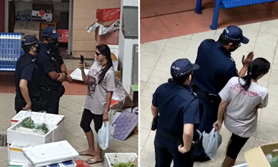 Enforcement action was taken against a woman who turned aggressive after she was approached by SG Clean Ambassadors for not practicing safe distancing at Shunfu Mart Food Centre on Tuesday (Apr 14).
