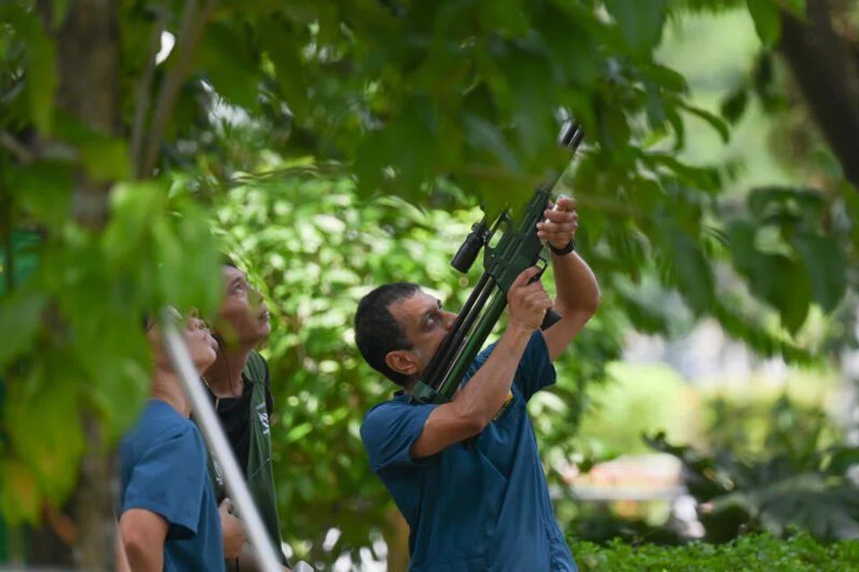 When The Straits Times arrived at Villa Verde Park at about 11.15am on Nov 1, several people – some donning NParks vests, others wearing Mandai Wildlife Group shirts – were seen there. A man was also seen with a long-barrelled dart gun.