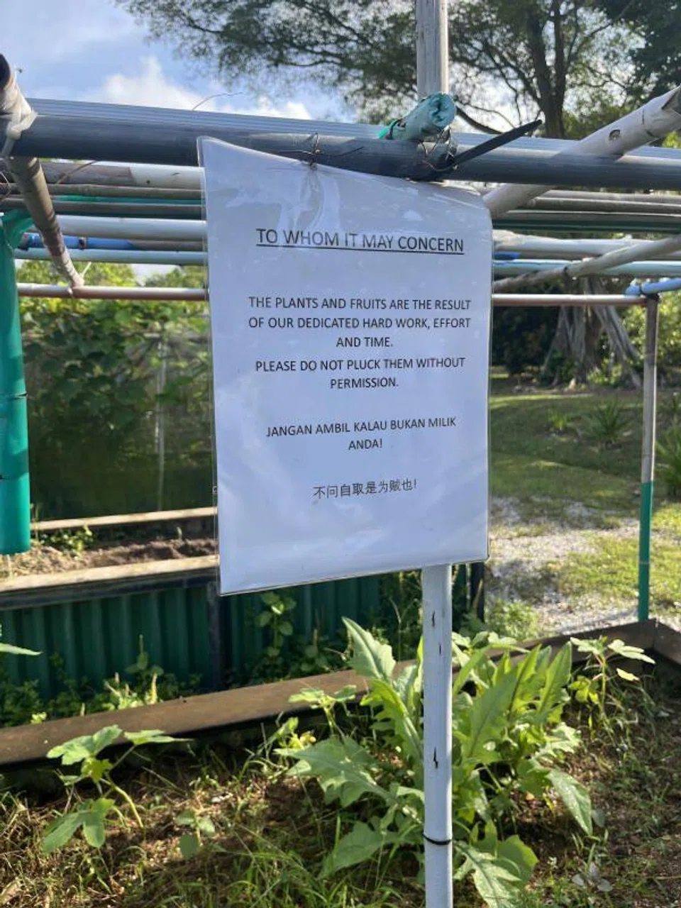 Mr Woo said these signs were installed around the allotment gardens to inform and remind the public not to remove or vandalise the plants and structures in the plots.