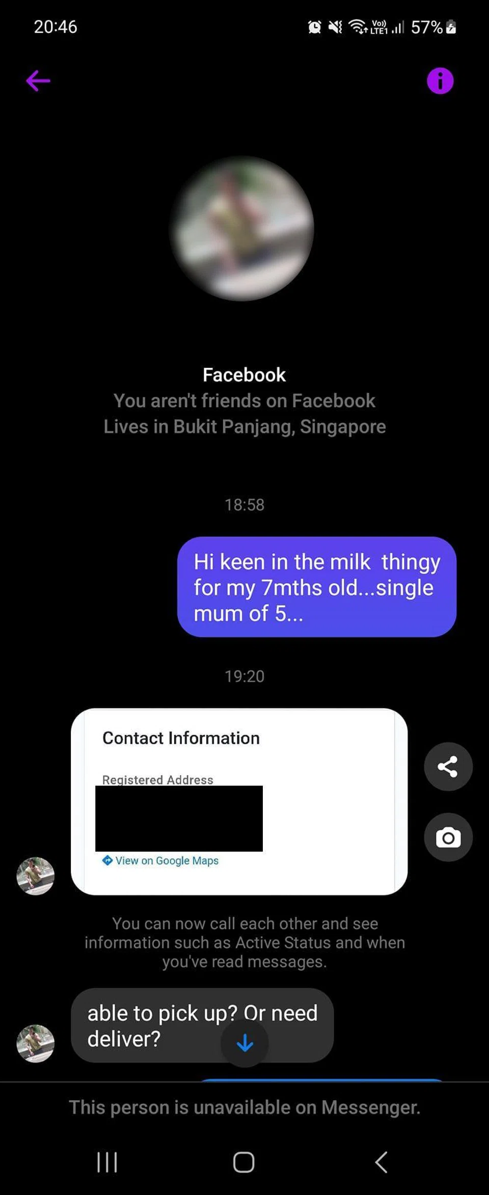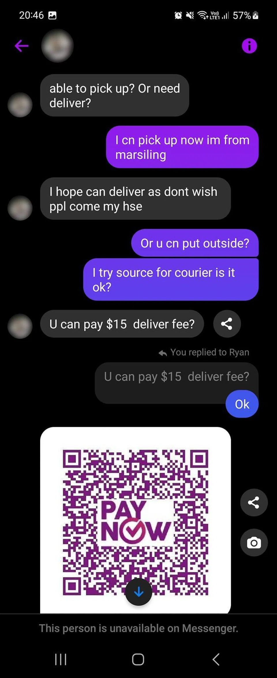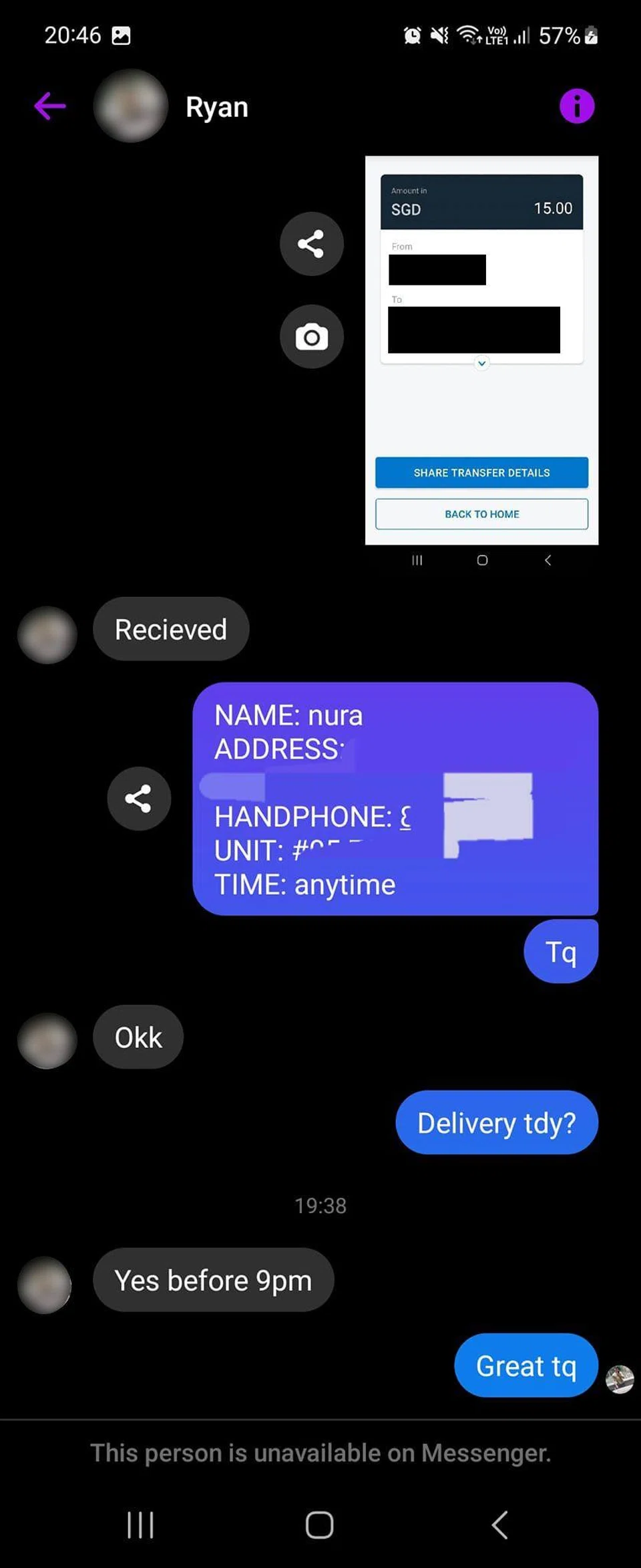 He then asked if she could pay $15 for the delivery fee, and she agreed to send him the money via PayNow.