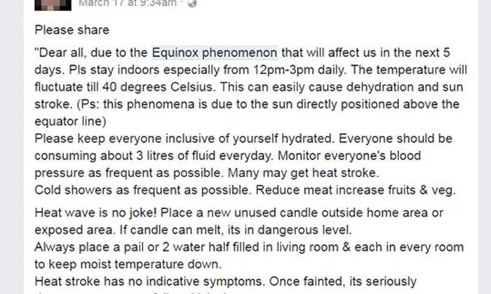 A message circulating on Facebook, which tells of temperature in Singapore rising as high as 40 degree Celsius due to a weather phenomenon termed ‘equinox phenomenon’, has been proven fake.
