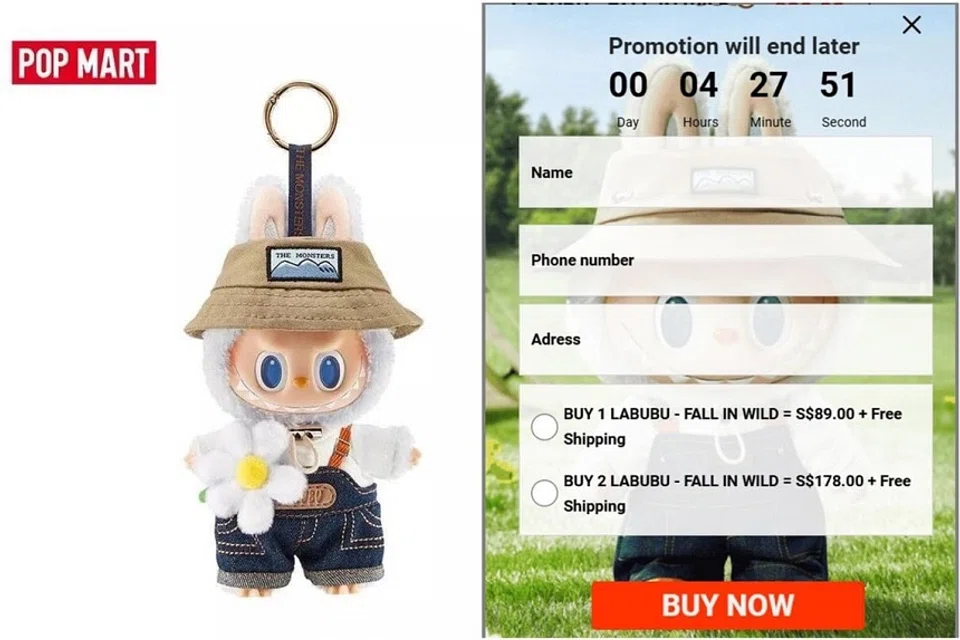 Adding a link to an external site, the post on the scam page read: "To ensure everyone has the opportunity to own this limited edition item, Pop Mart Plaza Singapura will open online sales on its official website, where customers can still enjoy the promotional offer."