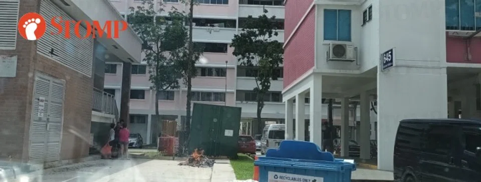 A group of people burned their offerings in the carpark in the middle of a Hougang housing estate, allowing the smoke and ashes to enter nearby homes.