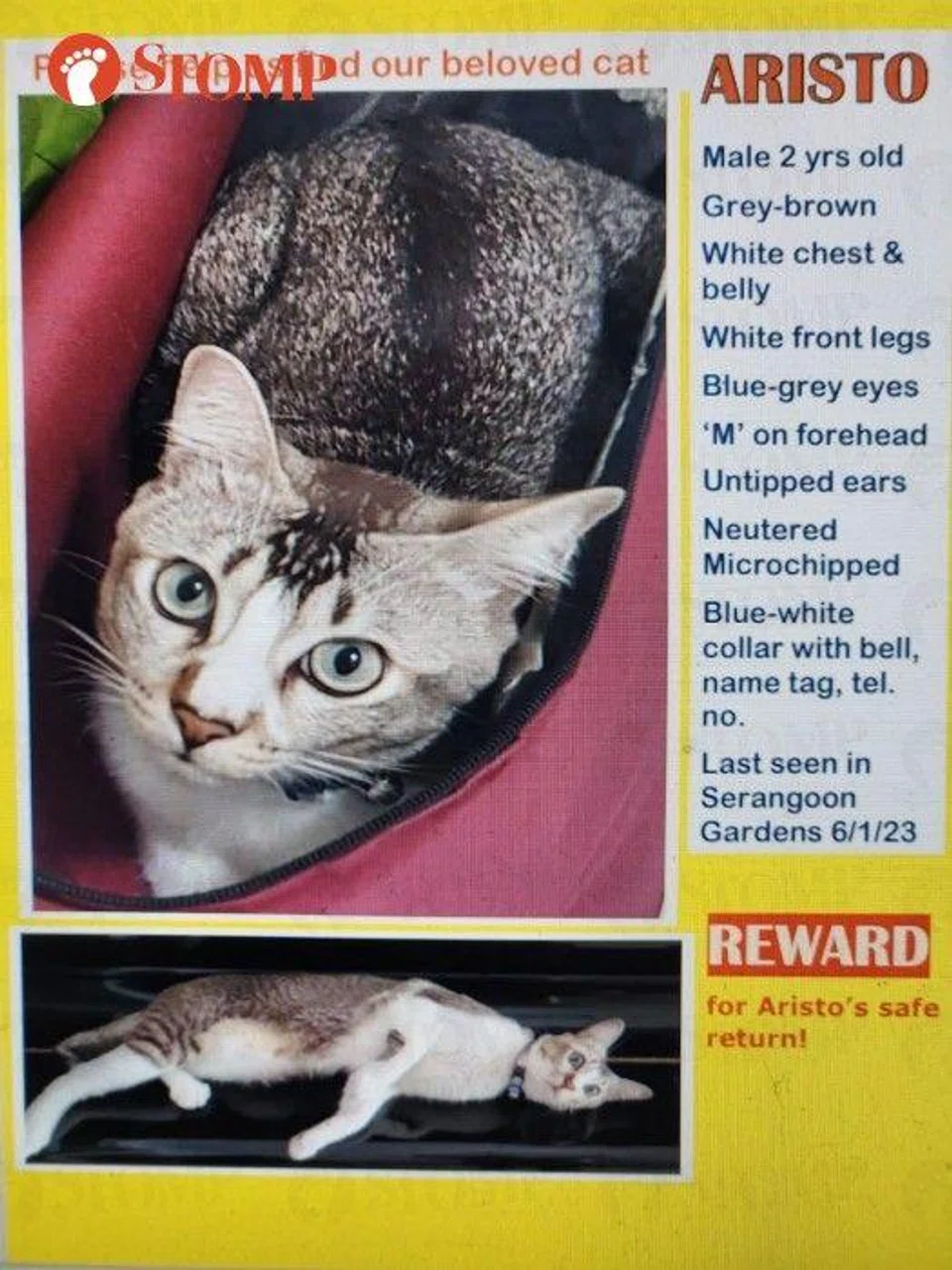 Stomper Macaw Mink said his cat Aristo was last seen in Serangoon Gardens.