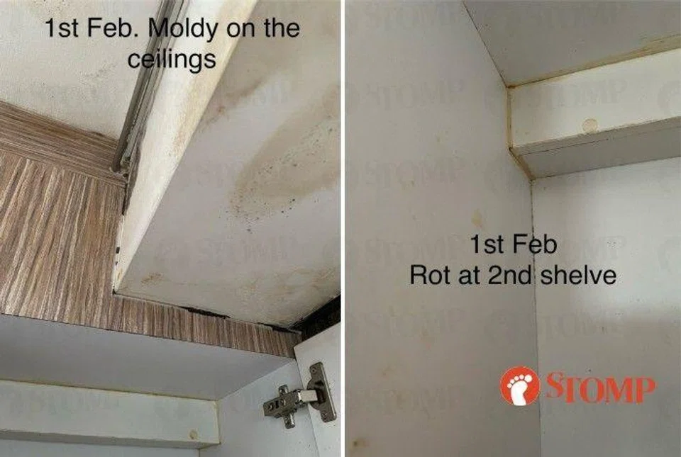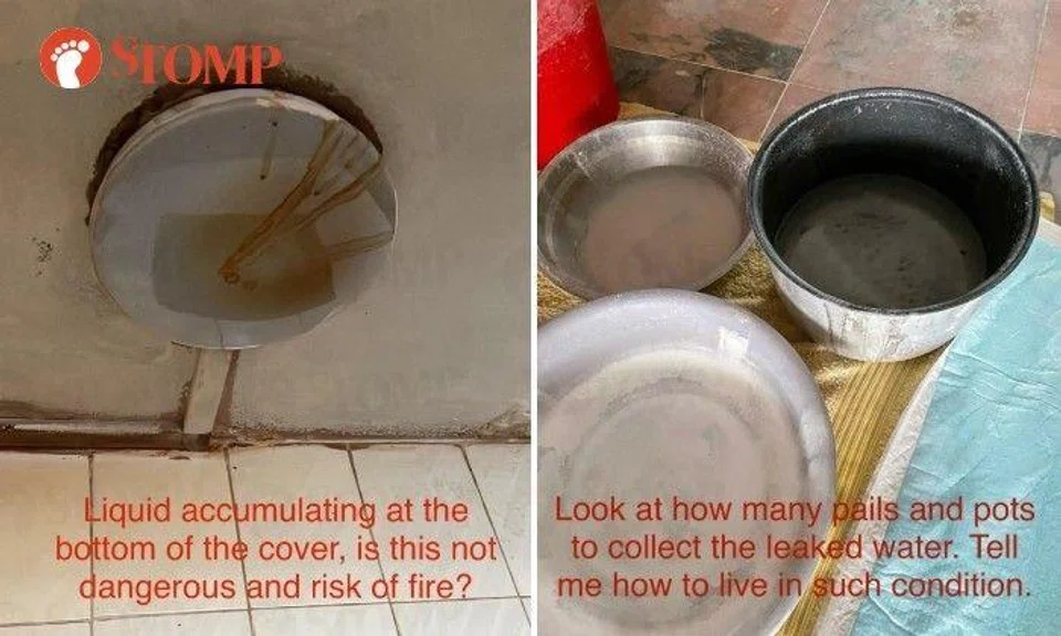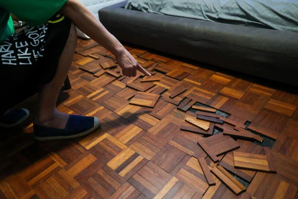 The son of the woman told Lianhe Zaobao the ceiling has been leaking water since 2022. It started in the kitchen, then spread to the living room and bedroom, where the flooring was damaged by the water.