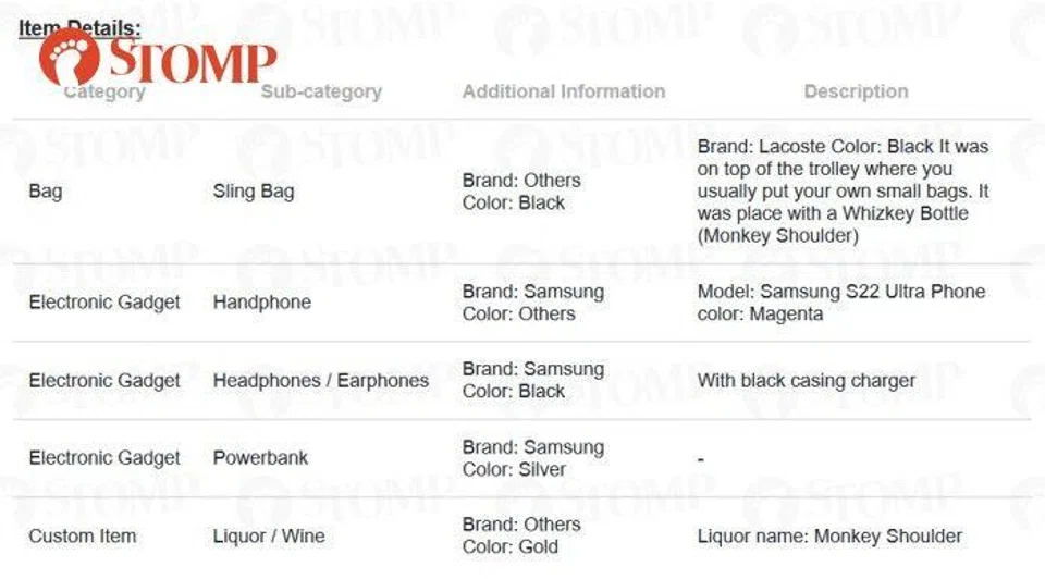 The missing bag contained valuables including a Samsung handphone, Galaxy Buds and power bank as well as a bottle of liqour.