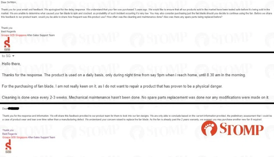 "As for the purchasing of the fan blade, I am not really keen on it because I do not want to repair a product that has proven to be a danger," said the Stomper in her email to the company.