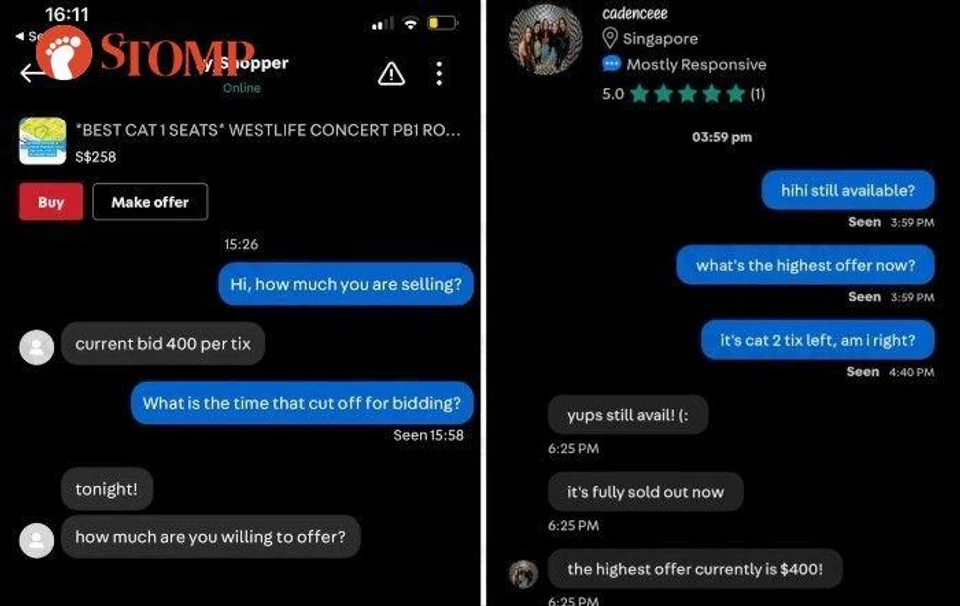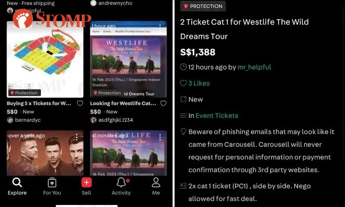 A Westlife fan was disappointed he was not able to get tickets for the Irish boyband's Feb 16, 2023, concert at the Singapore Indoor Stadium only to see the tickets listed on Carousell for as much as $1,388.