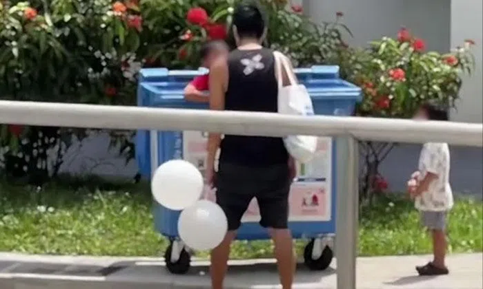 Meanwhile, the father, who is holding a tote bag and two balloons, appears unfazed as he delivers his “bin-tervention”.