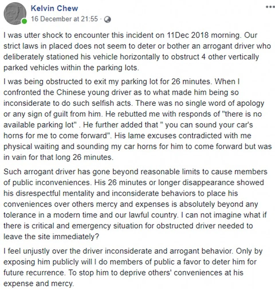 This is exactly what happened to Facebook user Kelvin Chew who said he waited 26 minutes for an Audi driver to move his vehicle so he could exit a parking lot near Block 346 Jurong East Street 31 on Dec 11.