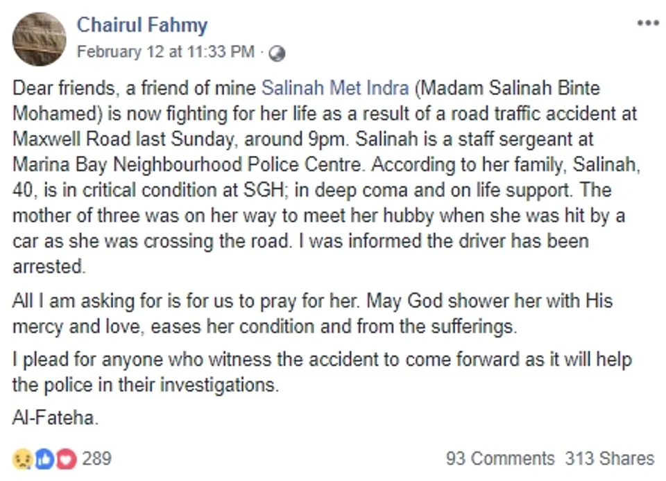 Madam Salinah's husband, Mr Indra Shaiful, 41, told The New Paper he was home with his children when he was told of the accident at around 10pm.