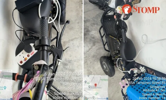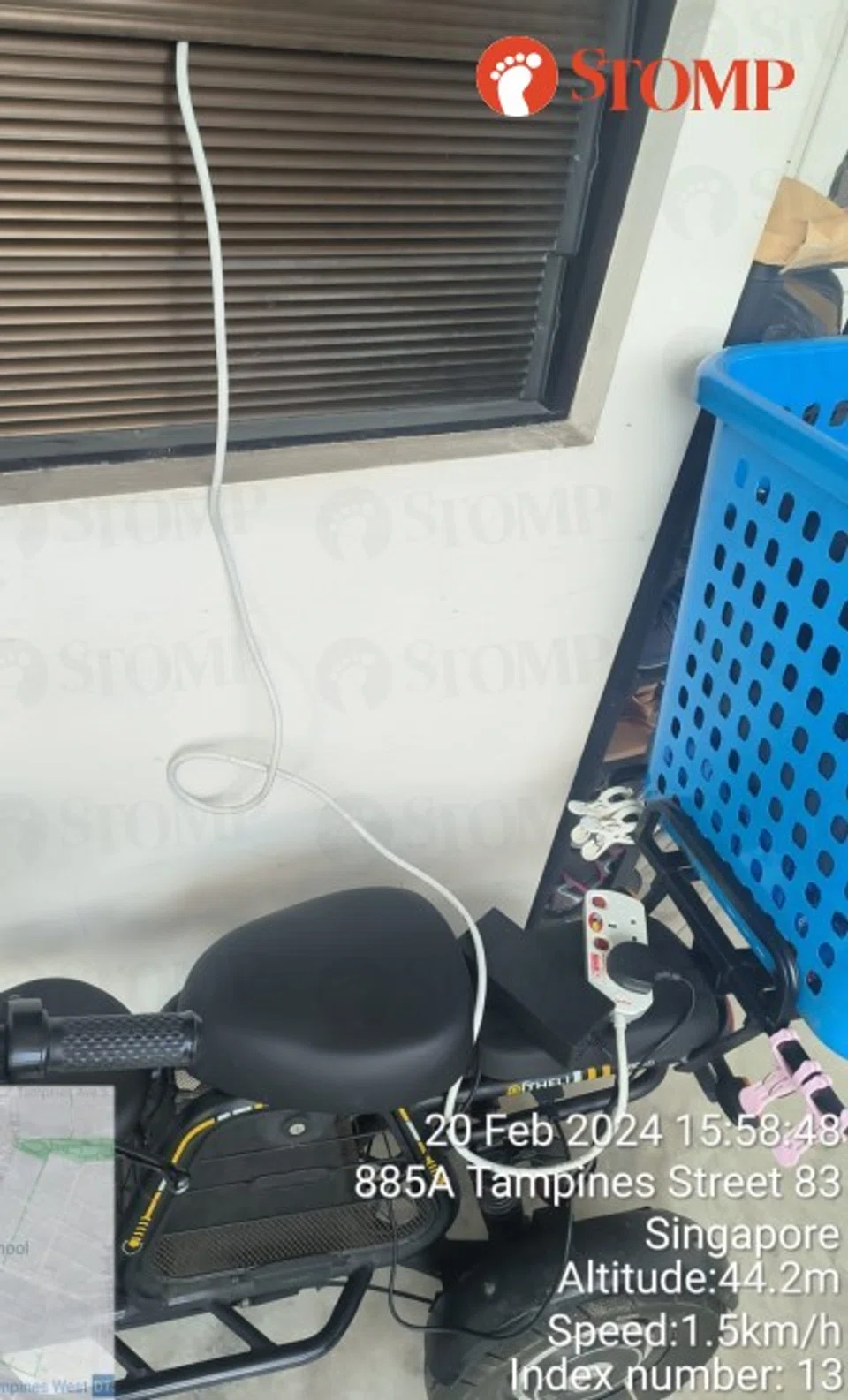 A Stomper, who is her neighbour at Block 885A Tampines Street 83, shared photos of the PMD connected to an extension cord through a window.