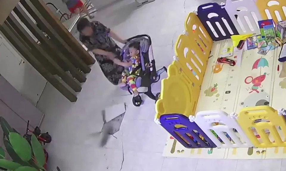 Video footage of the incident was put up on Facebook by the homeowner of Jan 23, and it shows the moment a part of the living room floor cracks and bursts into dust - startling a woman whose toddler grandchild is in a pram less than a metre away.