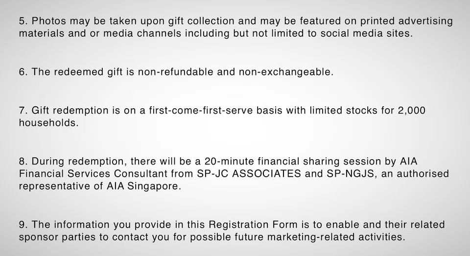 While the flyer is not a scam, if you plan to redeem the free blood pressure device, you should be aware of this line in the terms and conditions: "During redemption, there will be a 20-minute financial sharing session by AIA Financial Services Consultant from SP-JC Associates and SP-NGJS, an authorised representative of AlA Singapore."
