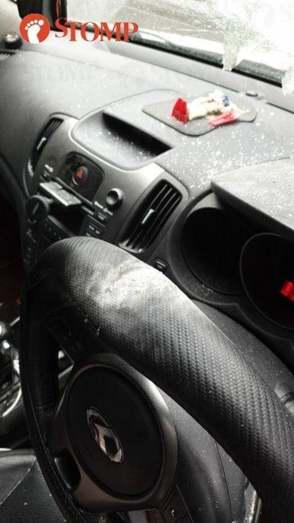 "My wife and I were shocked at the gaping hole and cracks left on the windscreen. Dust and glass particles were already irritating our eyes a bit, and we sustained some scratches.