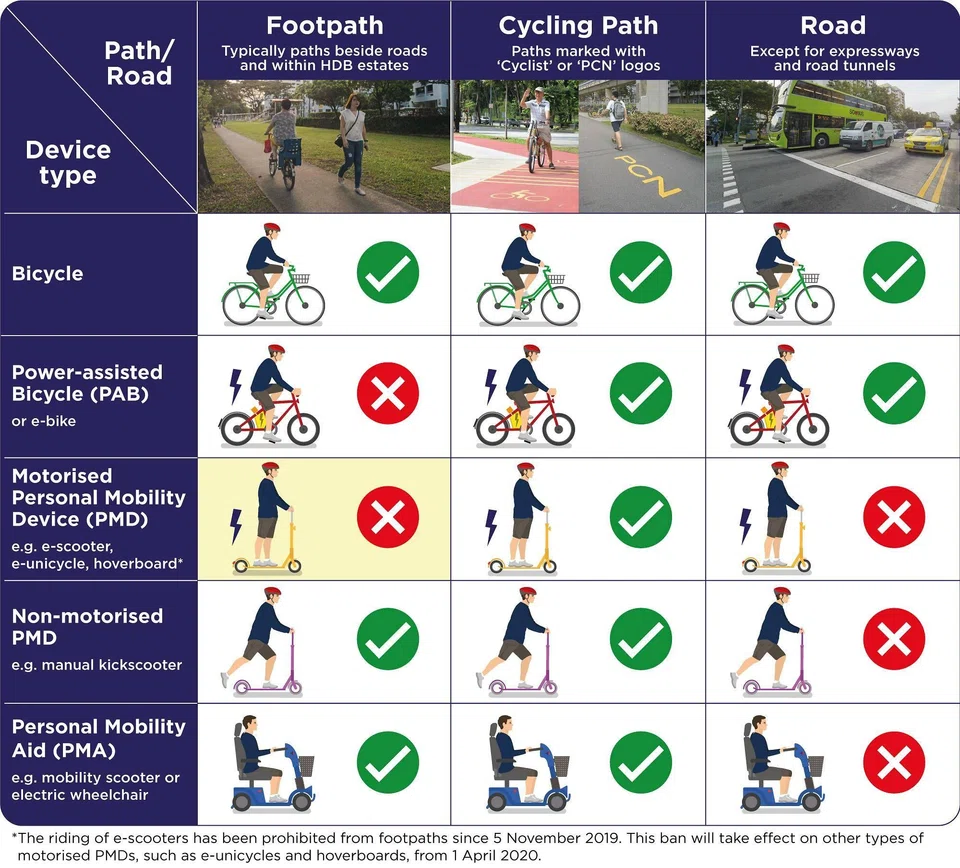 According to the Land Transport Authority website, the speed limit for PMAs is 10kmh and are allowed on the footpath and cycling path but not on the road.