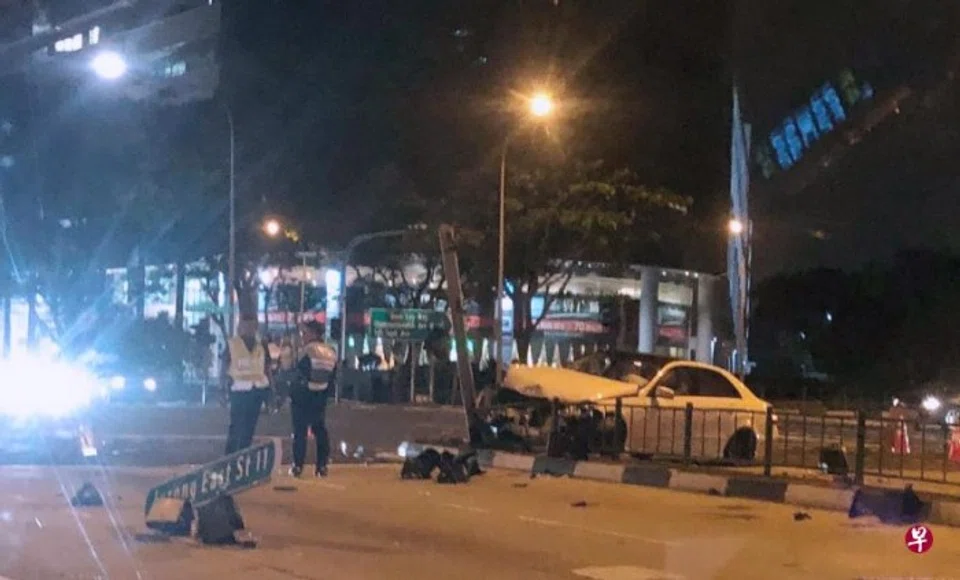 Photos published by Shin Min show a white Mercedes with its front bumper damaged after crashing into a road divider. The car had also hit a signpost.