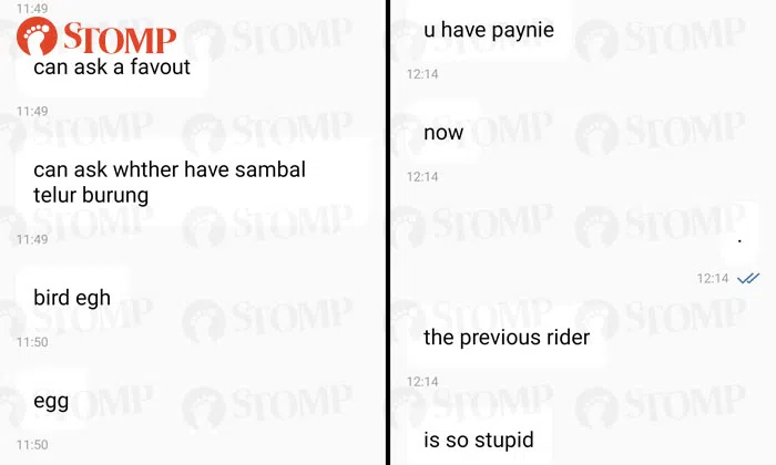 In the texts he shared, the customer asks for a "favour" and proceeds to request the rider add-on sambal telur burung (bird egg sambal) to her meal.