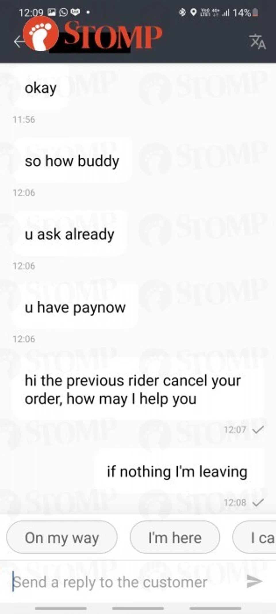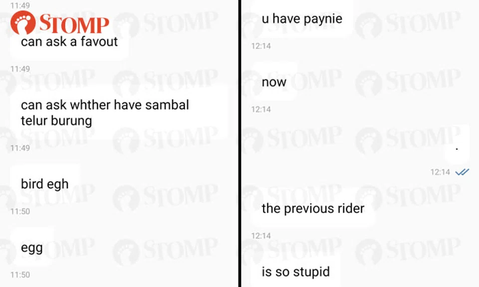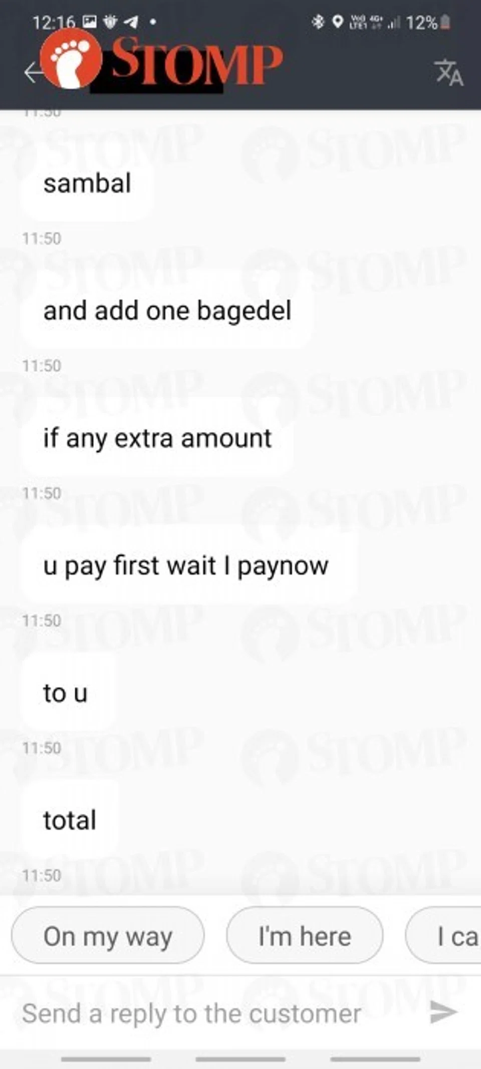 Stomper Anonymous shared with Stomp screenshots of a chat he had with a customer who had ordered nasi padang from Greenridge Shopping Center to be delivered to Segar Road.