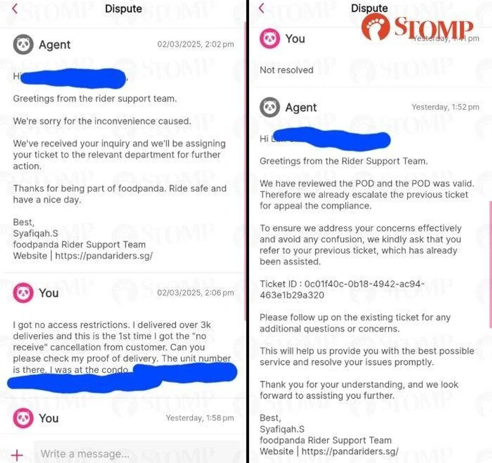In response to a Stomp query, a Foodpanda spokesperson said: "We are aware of this and have reached out to the delivery partner to resolve the issue.