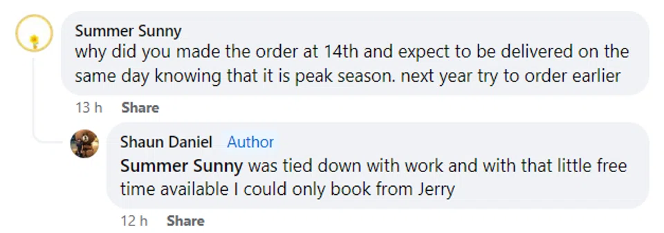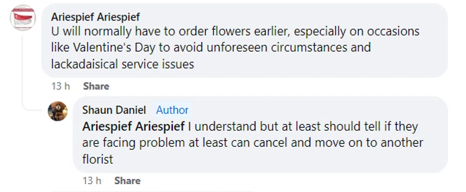 Some netizens sympathised with Shaun, but others questioned why he had waited till Valentine's Day to order the bouquet.