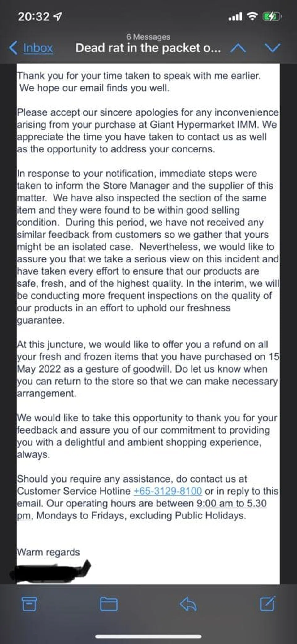 He said his wife made the purchase from Giant in IMM on May 15, and the disgusting discovery three days later.