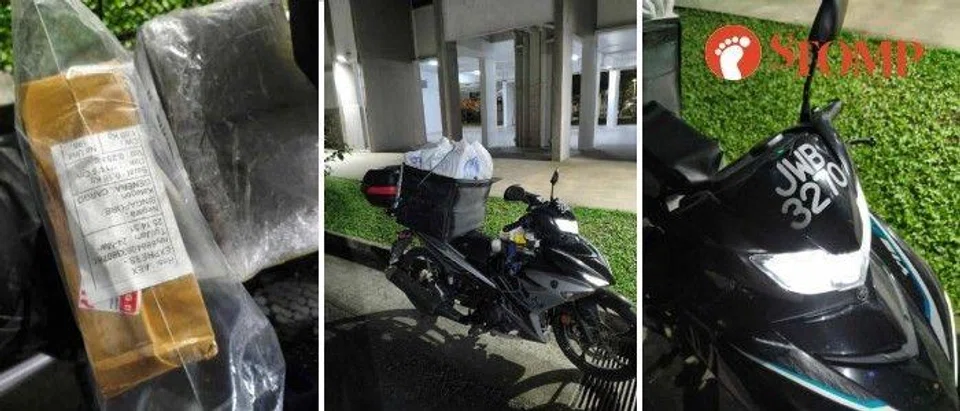 Stomper Coca shared photos of a Malaysian-registered motorcycle in Tampines with a box filled with deliveries.