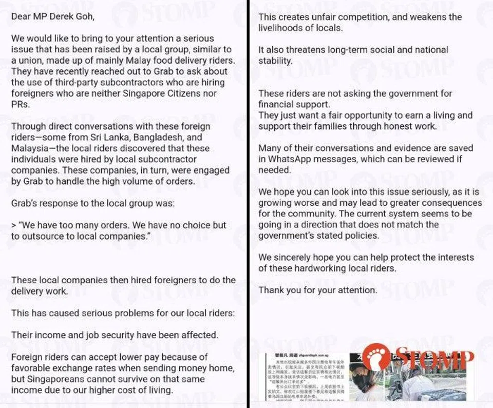 "Foreign riders can accept lower pay because of favourable exchange rates when sending money home, but Singaporeans cannot survive on that same income due to our higher cost of living. This creates unfair competition and weakens the livelihoods of locals."
