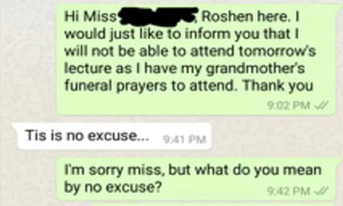 Dead grandmother is 'not a good reason to skip school' -- and teacher continues to ask for evidence with no condolences offered