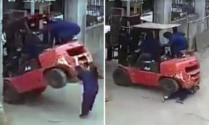 The woman was following behind the forklift that was going through a narrow passageway, as a clip posted by Muhaini Maksom shows.