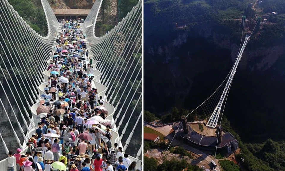 The world's longest and highest glass-bottomed bridge finally. opened in Zhangjiajie, China this past weekend.