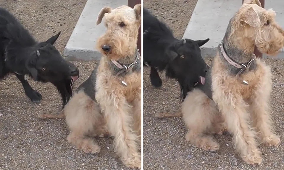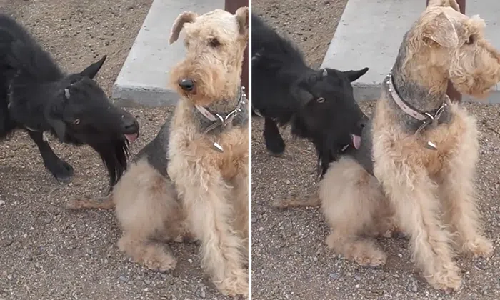You have 'goat' to be kidding me: Goat licks dog repeatedly but the pooch is unfazed