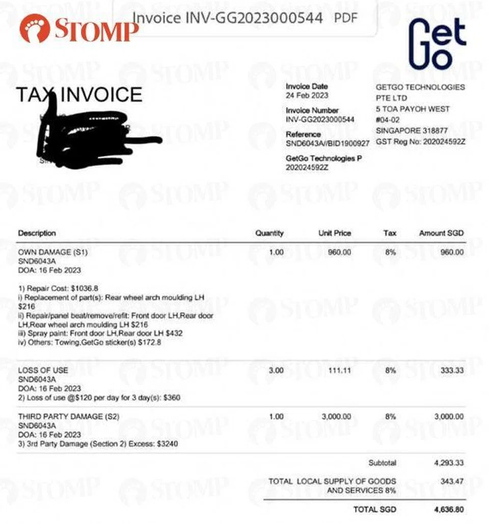 A GetGo car user was shocked to receive a bill for $4,636.80 after a "small accident" with a Mercedes-Benz in the Novena Square 2 carpark.
