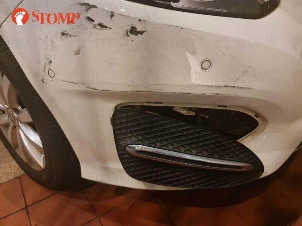 "Around 2pm, I was driving out from the parking lot. I turned left too soon and grazed a white Mercedes next to me," recounted the Stomper, who shared photos of the damage to the two vehicles.