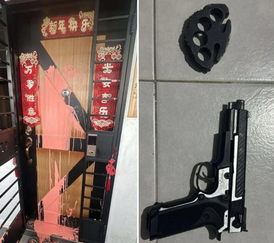 Geylang flat splashed with pink paint leads to arrest of man with drugs, knuckle duster and replica gun