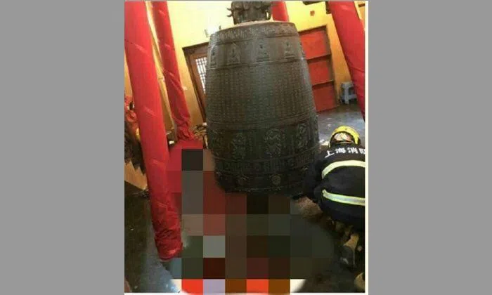 A giant bell suddenly fell on a woman at Shanghai's Jing'an Temple on Sunday morning (Mar 5), trapping her underneath and severely injuring her thigh.