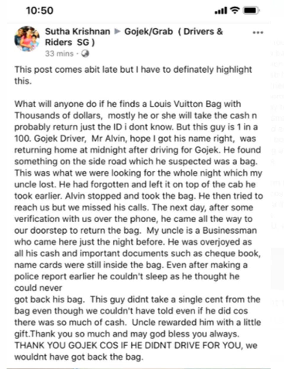 Sutha wrote: "He was overjoyed as all his cash and important documents such as cheque book, name cards were still inside the bag."