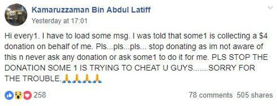 Apologising for the "trouble", Mr Kamaruzzaman posted on Facebook: "I was told that someone is collecting a $4 donation of behalf of me.