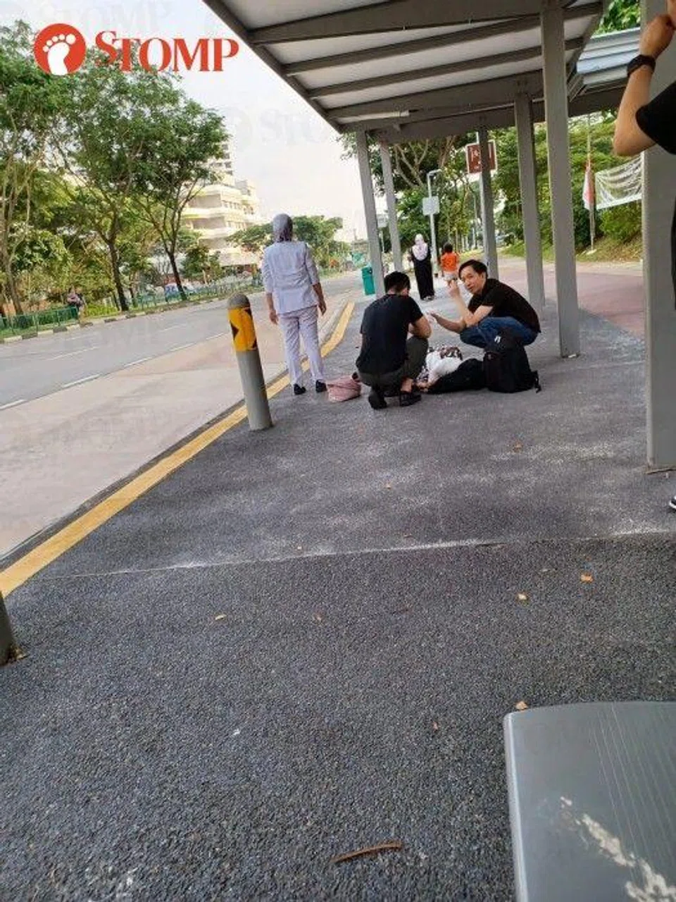 Good Samaritans aid woman lying on ground at Tampines bus stop, wait for ambulance with her