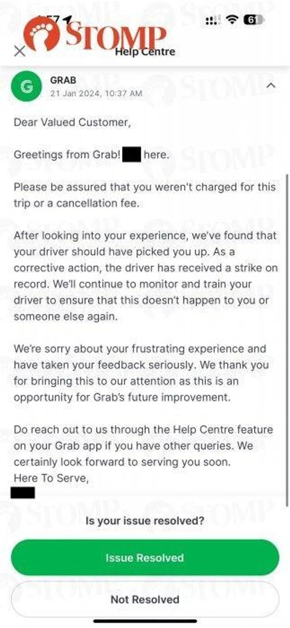 She has since reported the matter to Grab. A representative told her that the driver had received a strike on record as a corrective action.