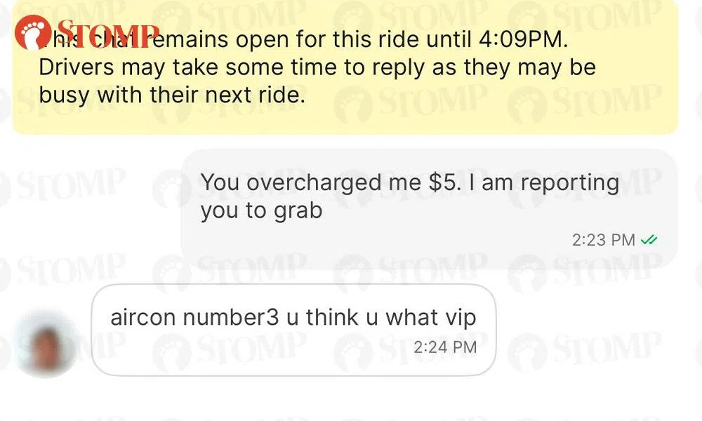 A passenger who requested air-conditioning during a Grab ride was surprised to receive a message from the driver after the trip, informing him that a $5 charge had been added for what the driver called "VIP treatment".