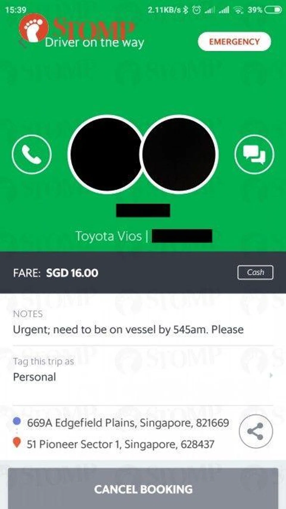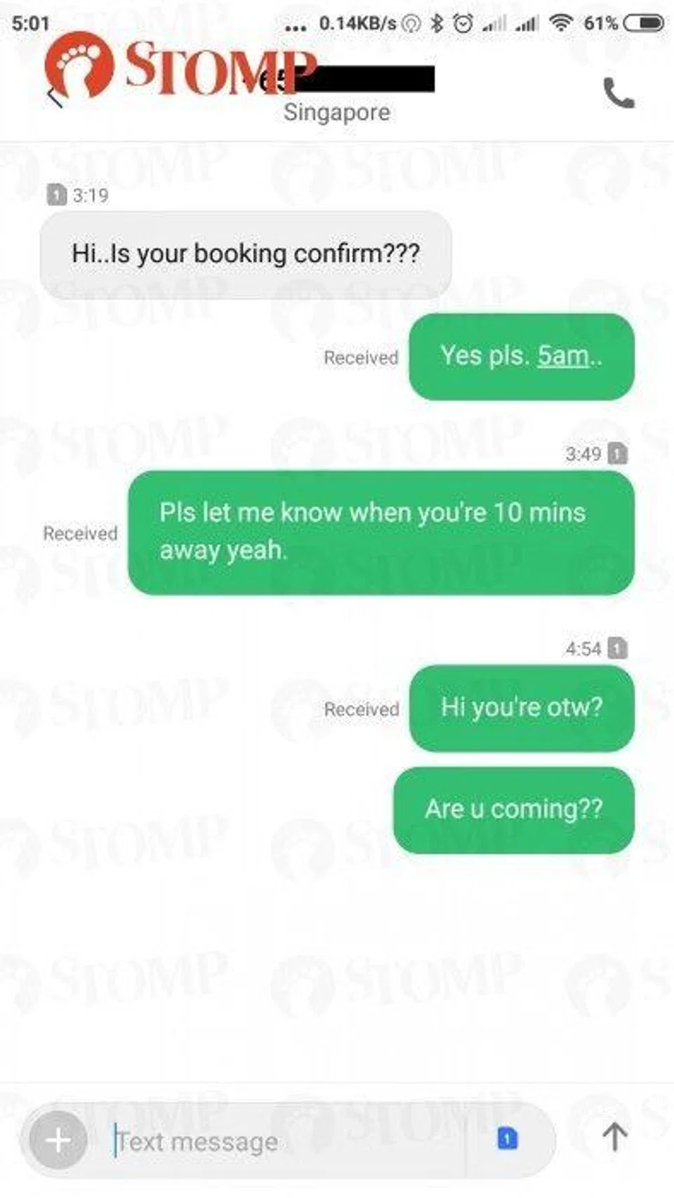 The Stomper, who wanted to be dropped off at his workplace in Tuas, included a note in his booking about needing to arrive by 5.45am.